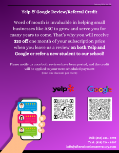 Free trial lesson: Just like you wouldn’t purchase a car without test-driving, we believe that it’s important for you to find out if our school is the right fit for you or your child before you make any commitment. We offer a free 15-minute trial lesson with a facility tour and a consultation.